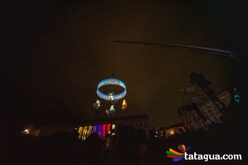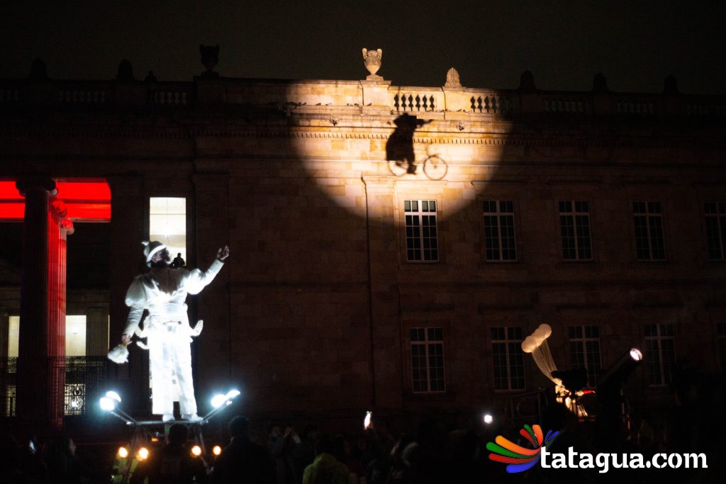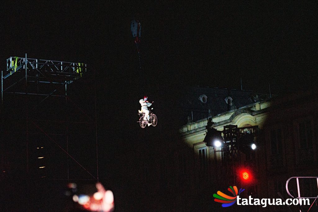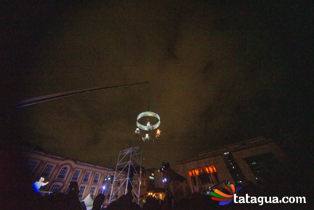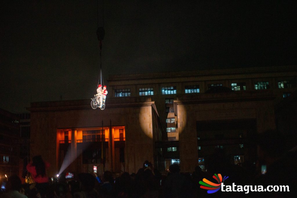 Al cielo bogotano de la Plaza de Bolívar llegó ángeles que con sus voces, movimientos y pedaleos ofrecerán el ‘show’ de inauguración gratuito para toda la familia. Fuegos artificiales, globos, plumas y bicicletas se alzarán al firmamento al compás musical durante un espectáculo aéreo que fusiona la ópera con el circo. En el corazón de la capital se desarrollará una historia de amor que partirá desde la tierra, pero de a poco se elevará hacia las estrellas. Con apoyo de imágenes cinematográficas, algunos ángeles balancearán sus cuerpos y otros volarán. En esta narración nocturna, la unión y la esperanza surgirán con invasión de luces en medio de la oscuridad. Este mundo de sueños poéticos ha recorrido más de treinta países. Ha viajado desde Europa y Asia hasta Oceanía y Latinoamérica. Este es el regalo inaugural de FIAV Bogotá para todas las edades.